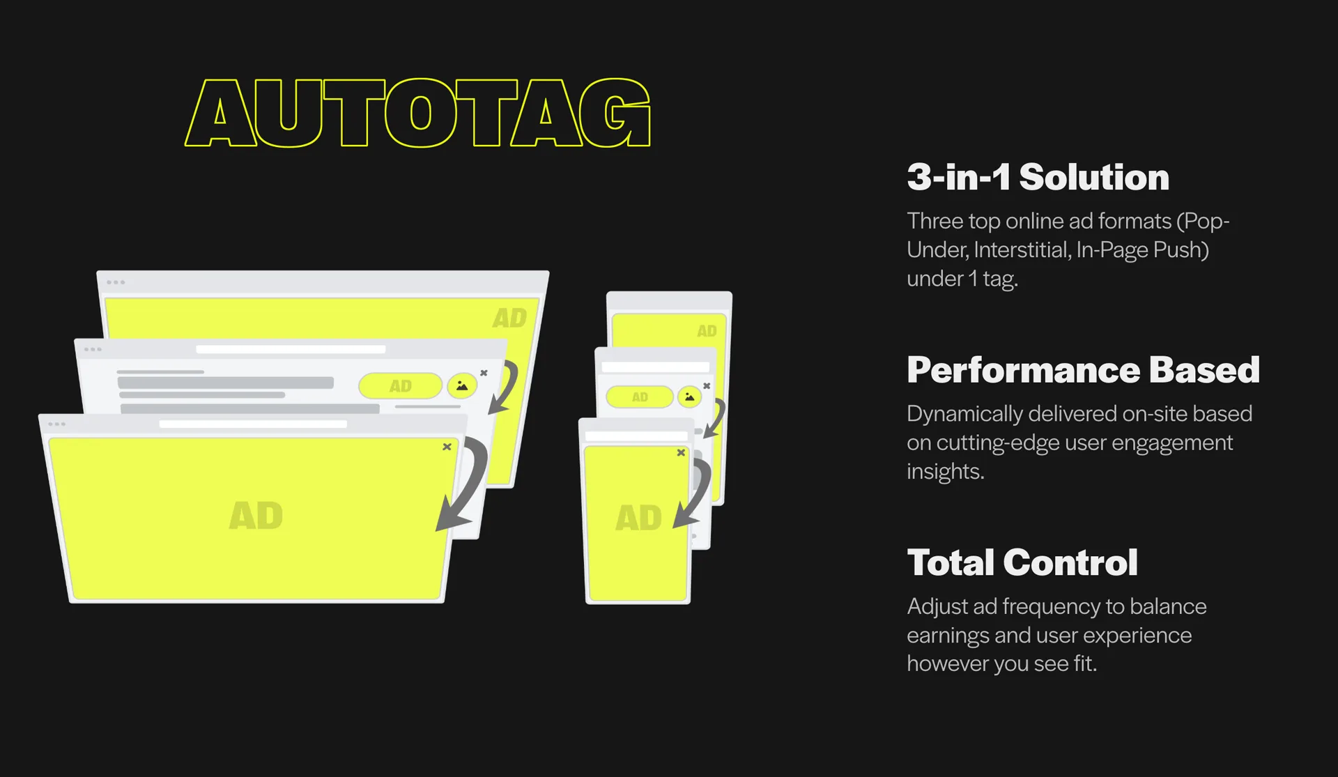 Why juggle formats when one tag can do it all? Autotag bundles three top performers – In-Page Push, Pop-Under, and Interstitial – into a single, easy-to-integrate solution. Plus, its Monetization Goal feature gives you control over how often ads appear, balancing user experience with max revenue.