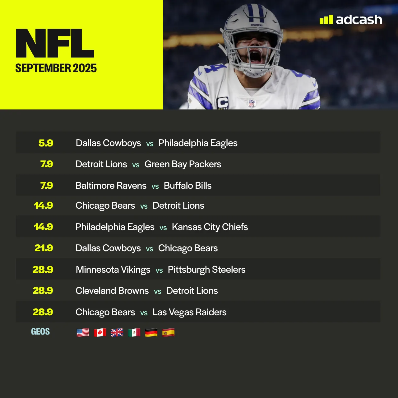 Yeah, football fans are everywhere, but if you want your ads to actually hit hard, focus on the big dogs: United States, Canada, UK, Mexico, Germany, and Spain. Don’t overcomplicate it, these geos are where the money’s moving.